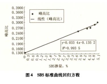 為驗證回歸方程的準確性,對實驗室制備的SBS摻量為4.3%的SBS改性瀝青進行光譜分析,計算得出4.3%的SBS改性瀝青峰高比(O.2793)帶入回歸的方程中,反推出SBS含量4.31%,與理論值基本一致。表明該回歸方程可 作 為SBS 改 性瀝青 SBS含量檢測的標準計